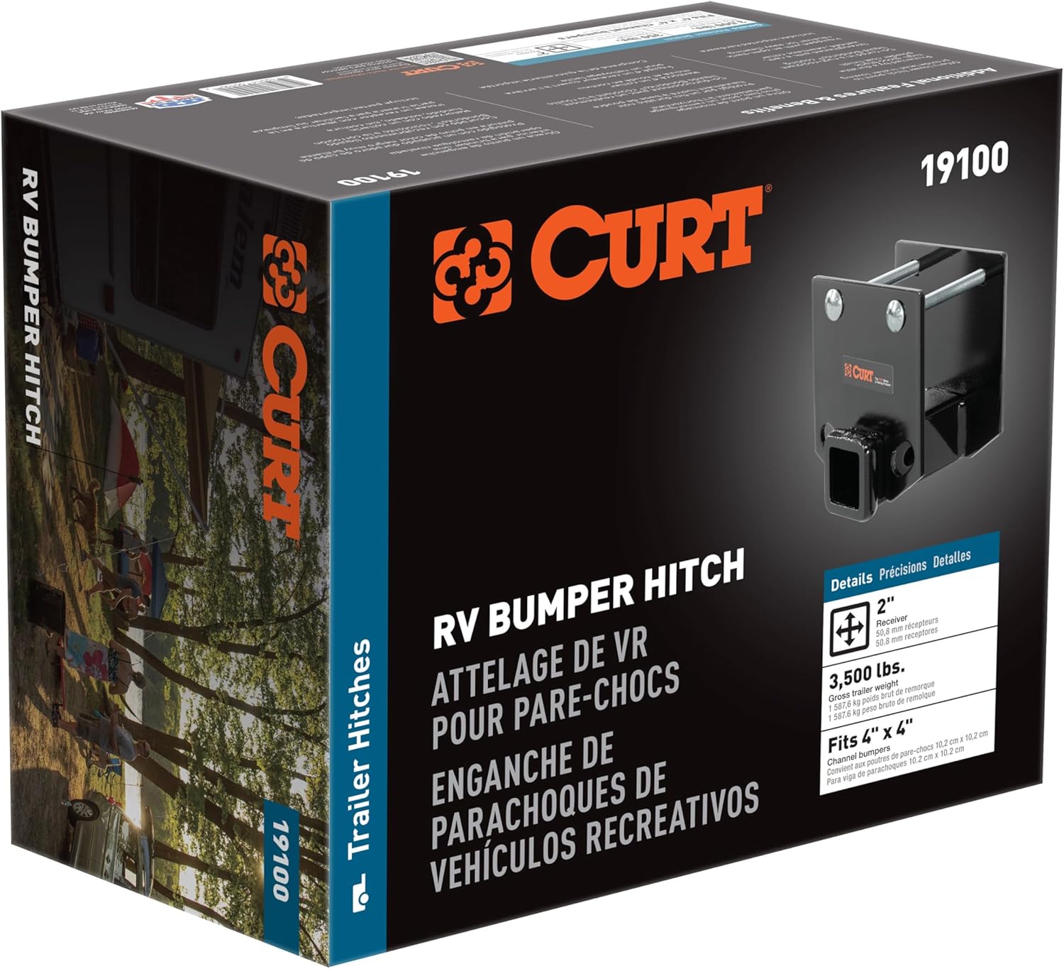 A CURT RV hitch is a trailer hitch that is designed to mount onto the back of a recreational vehicle to add extra cargo space. These hitches are manufactured using CURT's quality processes of robotic welding, thorough cleaning and precise finishing. Our RV bumper hitches are coated with a liquid A-coat followed by a gloss black powder coat finish for lasing resistance against wear and corrosion, and they offer a 2" x 2" receiver tube opening. This particular bumper hitch features a gross trailer weight capacity of 3,500 lbs. and a tongue weight capacity of 350 lbs., making it an excellent choice for towing a bike rack, cargo carrier, boat trailer or small utility trailer behind your RV. It can also be used for towing a recreational vehicle trailer, allowing you to bring with you that ATV, personal watercraft, dirt bike or whatever toys you like to have along for the ride. Be sure to always check the gross trailer weight and weight rating of the bumper before towing. CURT RV hitches are not just another accessory for your camper; they are a product of smart engineering and quality construction to help you achieve that ultimate RV experience every time you hit the road.