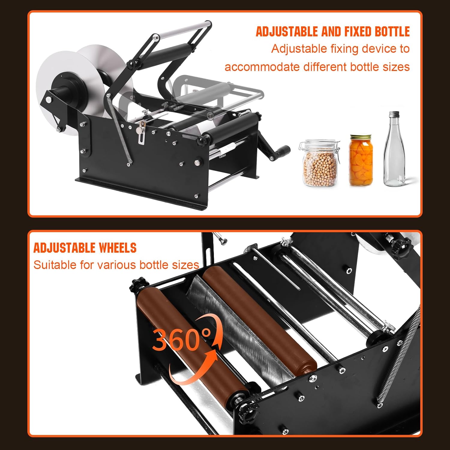 • Practical Advantages: Adjustable fixtures accommodate different bottle sizes quickly. This manual labeling machine requires no power connection, promoting energy savings, and is for applying transparent labels efficiently.