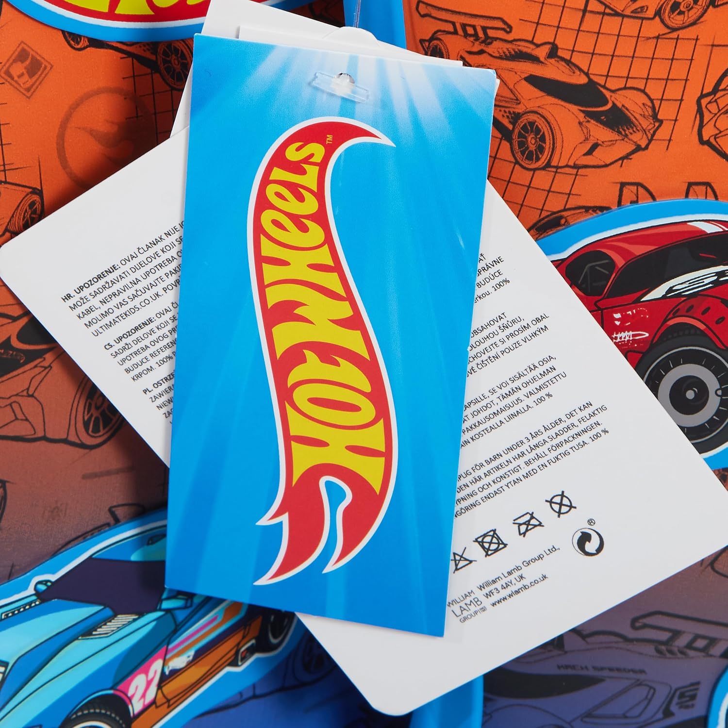 HOT WHEELS RUBBER RAIN BOOTS. Official Hot Wheels merchandise. Each pair is designed in a sleek blue and orange color theme with a vibrant racing car background. The standout feature of these wellingtons is the iconic Hot Wheels logo along with two stylized, full colour racing cars. These boots are perfect for all weathers. They are water-resistant and have a fantastic non-slip, grip sole. Made from natural rubber, the boots undergo the classic vulcanization heating process, which ensures flexibility, durability, and comfort. They also come with an easy wipe-clean finish.