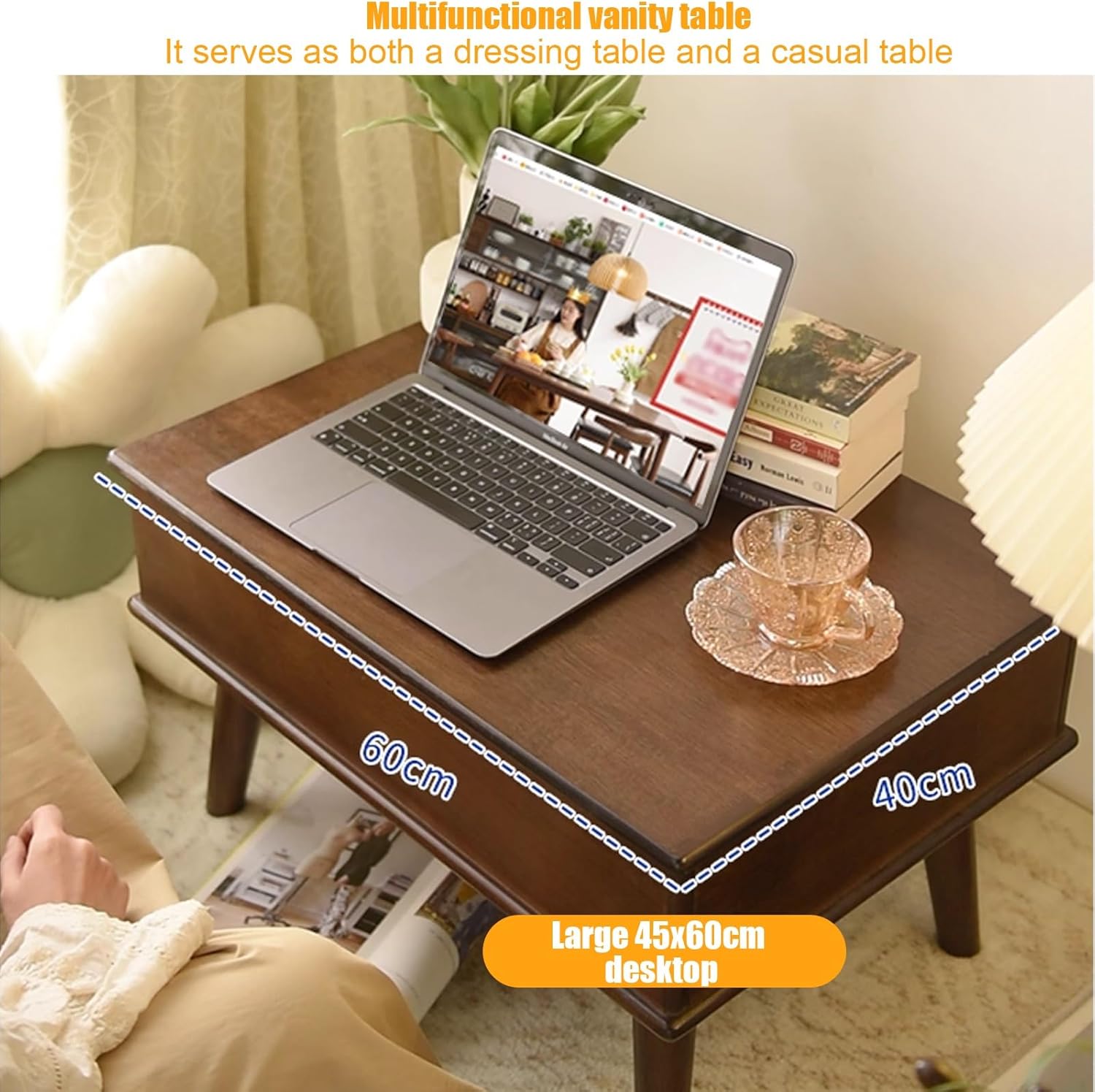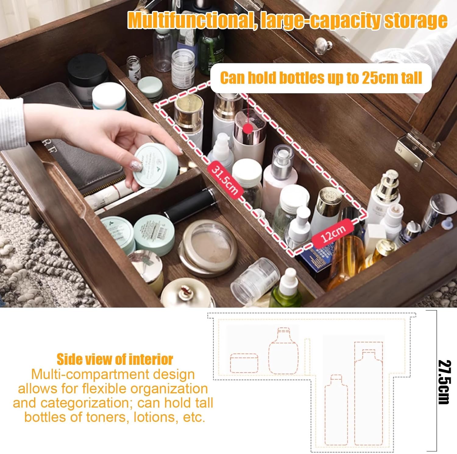 This make up dressing table combines aesthetics and practicality. It features an adjustable high-definition silver mirror with a rear tilt angle and a front mirror, providing a seamless makeup application view. The table itself boasts a multi-compartment storage design and a recessed tall bottle storage area, easily accommodating even tall cosmetic bottles. Closing the mirror instantly transforms it into a spacious desk, achieving two uses in one.Product Name: solid wood makeup vanity, vanity desk with mirror, real wood vanity, solid wood vanities, vanity tableMaterial: Rubberwood + Hardware AccessoriesColor: WalnutDimensions: 59x42x36cm (23.2x16.5x14.1in)Suitable Locations: Living Room, Bedroom, Bay WindowAssembly Method: Easy-install table legsPackage Contents: vanity desk with storage x1Note:1. This product is handmade; dimensions may vary by 1-3 cm.2. Due to differences in lighting and screen display, the actual product color may slightly differ from the image.