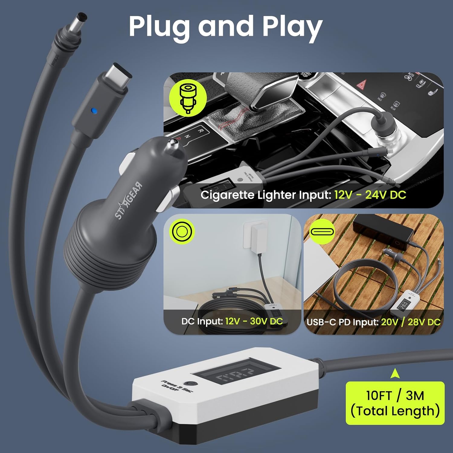 Starlink Mini Cable 10FT/3M, 3 in 1 Cable with Digital Voltage Display & On/Off Switch, 16AWG USB-C/Cigarette Lighter Car Adapter/DC to DC Starlink Mini Power Cable, Work with 140W+ PD Supply,STARGEAR Starlink Mini Car Adapter 12V to 24V DC Step Up Converter with 60W Car Cigarette Lighter Adapter, Starlink Mini 12V Adapters Supports 16 AWG Official 30M, Ideal for RV, Boat, Trailer