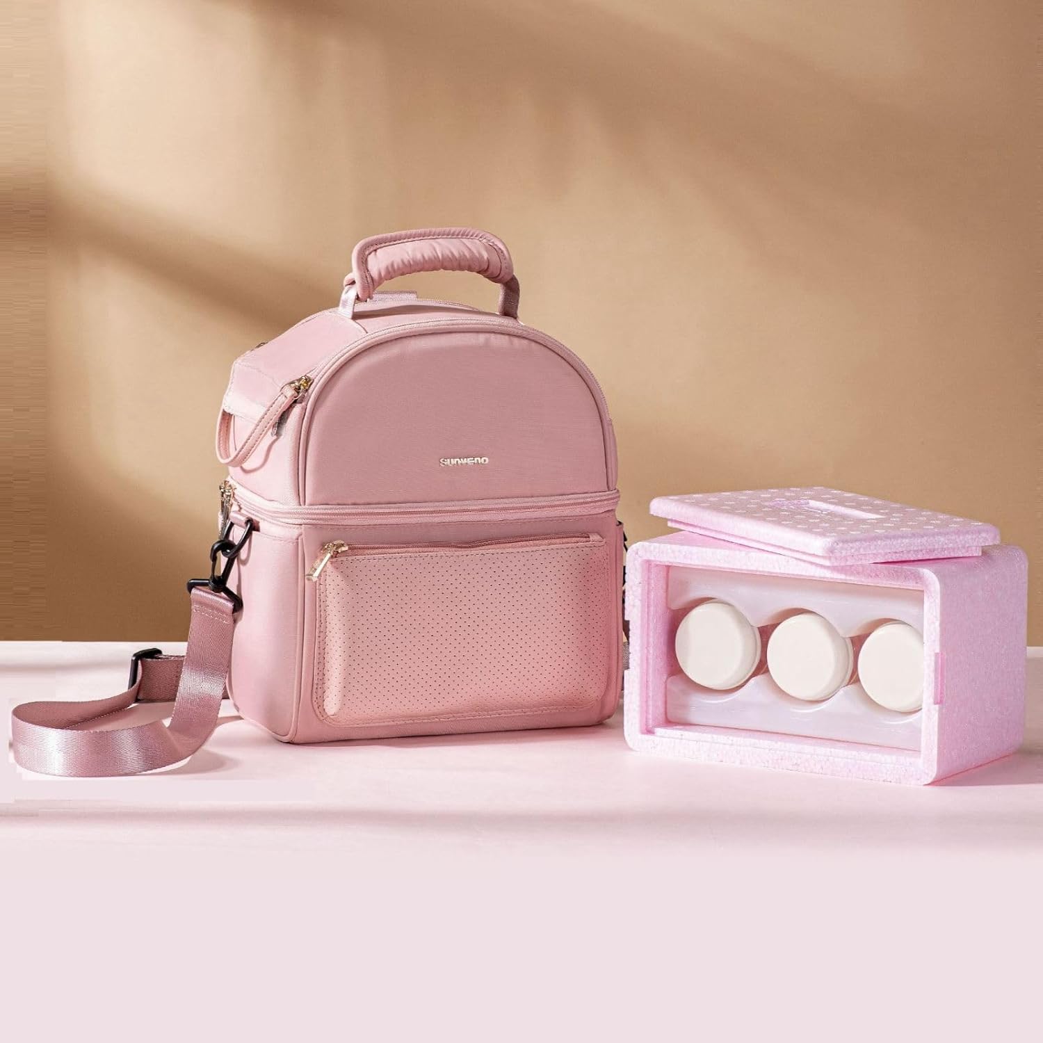 SUNVENO Breast Milk Cooler Bag with Detachable Insulation Box, Double-Layer Pumping Travel Bag for Work & Daycare, Fits Bottles, Ice Packs and Pump Parts,Pink